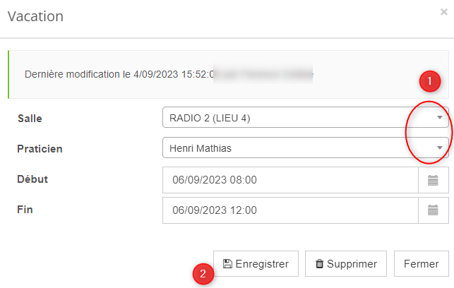 - Positionnez vous à la date concernée par la modification, puis cliquez sur la vacation du praticien