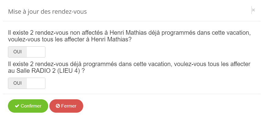 - Si des rendez-vous sont déjà positionnés dans la première salle avec le premier praticien, une pop up vous proposera :