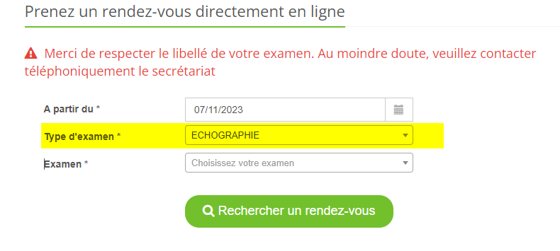 Dans cet exemple, seul le type d'examen ECHOGRAPHIE étant proposé à la prise de rendez-vous en ligne, il est donc déja indiqué dans le champ "Type d'examen"