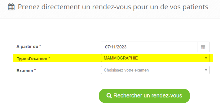 Dans cet exemple, seul le type d'examen MAMMOGRAPHIE est proposé en ligne aux prescripteurs demandeurs, et donc déjà indiqué dans le champ "type d'examen"