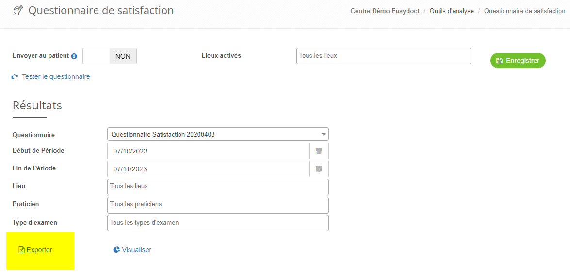 13/09/2023 Exporter les résultats du questionnaire de satisfaction Support easydoct 22 octobre 2024 12:46 Mise à jour S’abonner Il est désormais possible d'exporter les résultats d'un questionnaire de satisfaction Articles associés 08/09/2025 Bouton "patient précédent" sur le portail prescripteur Récupérer mon compte-rendu d'examen envoyé par email Télécharger un document d'examen envoyé par le centre 10/06/2025 Filtrer le menu statistiques Commentaires 0 commentaire Cet article n'accepte pas de commentaires.