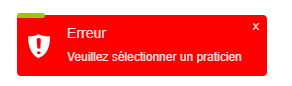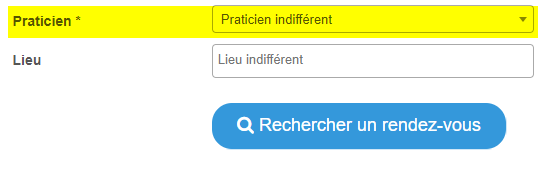 NB : Si le patient ne complète pas la ligne "praticien", un message d'erreur l'obligera à indiquer le nom du praticien afin de pouvoir continuer sa recherche de rendez-vous