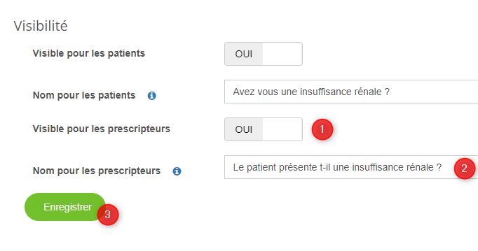 - Sur la ligne "Visible pour les prescripteurs", basculez le bouton sur OUI