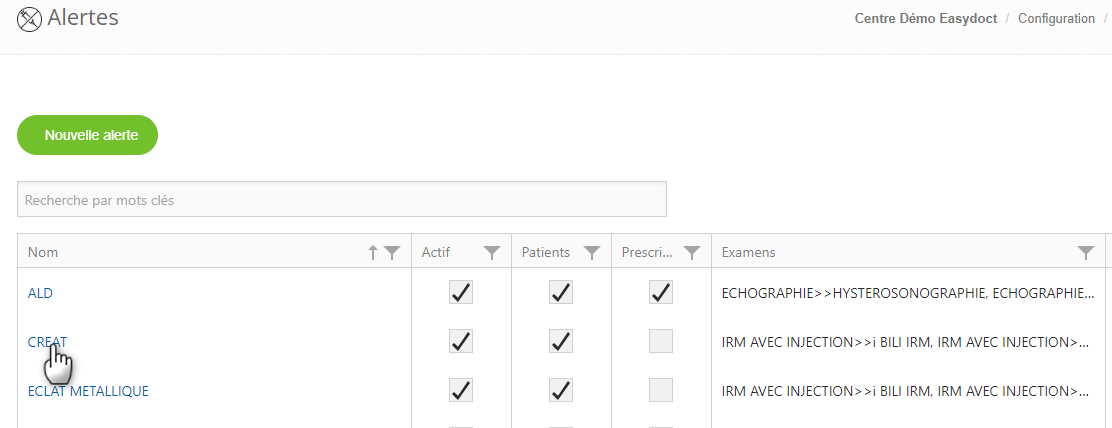 MENU > CONFIGURATION > EXAMENS > Examens > Alertes