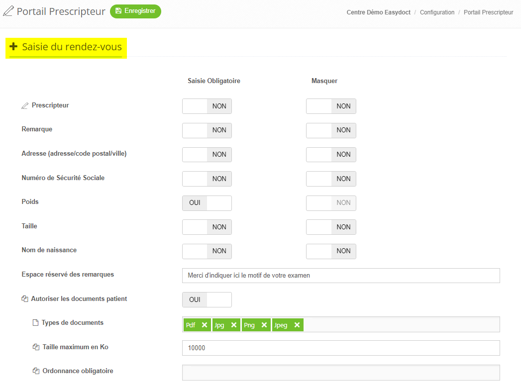 Rubrique Saisie du rendez-vous : indiquez la saisie qui doit être obligatoire ainsi que les champs qui doivent être masqués, les documents, l'ajout obligatoire d'une ordonnance etc...