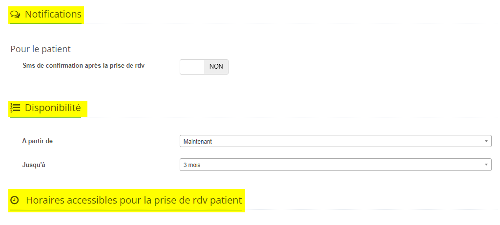 - Rubrique Notifications: choisissez si le patient doit recevoir un sms de confirmation de rendez-vous