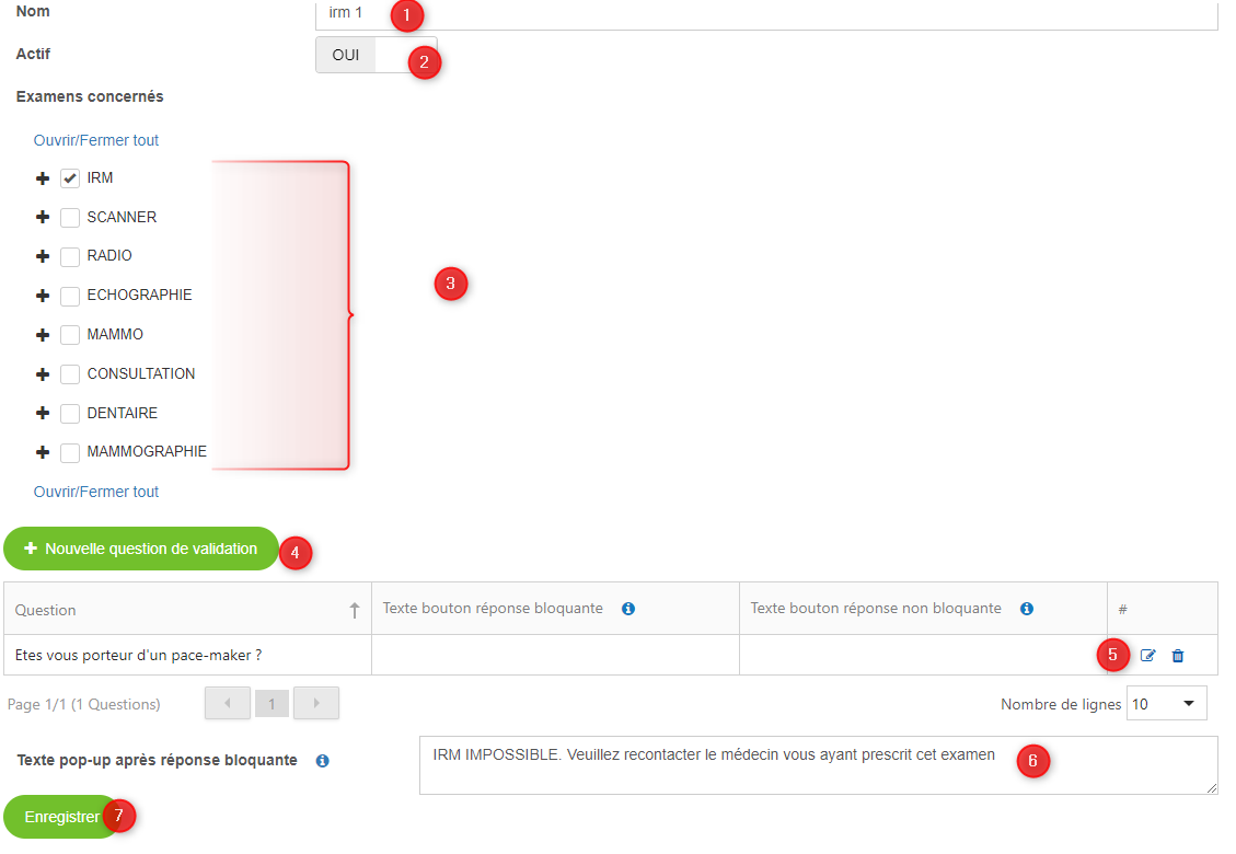 Créer différents questionnaires de validation pour un même examen avec des informations différentes pour le patient lors d'une réponse positive