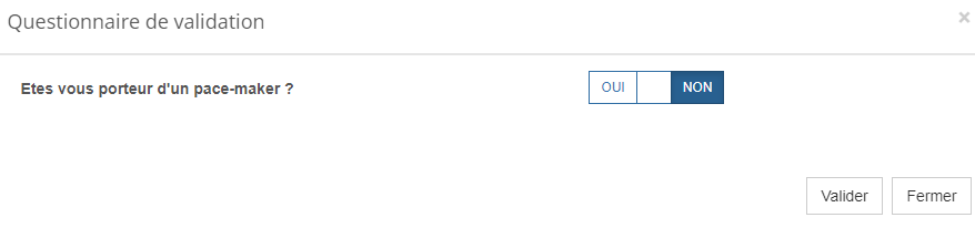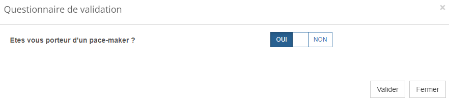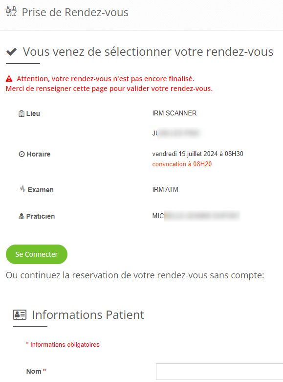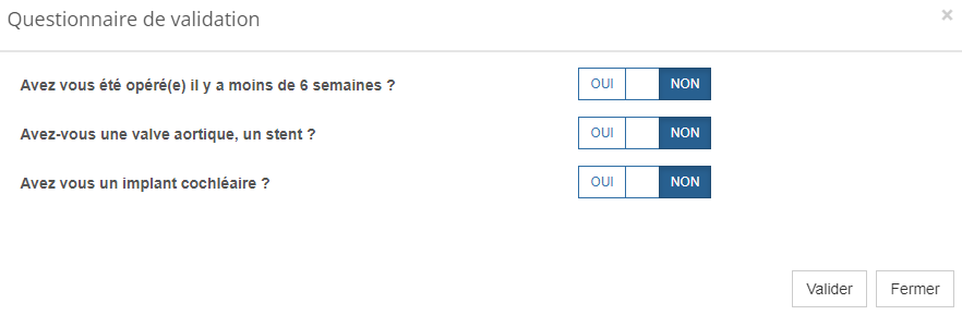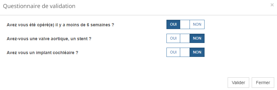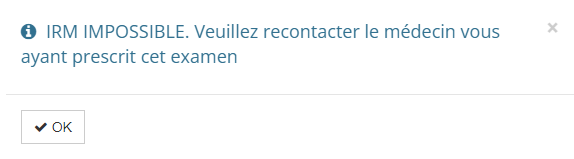 - Lorsque le patient aura choisi son créneau de rendez-vous, le premier questionnaire s'affichera dans une pop up (dans cet exemple "irm 1")