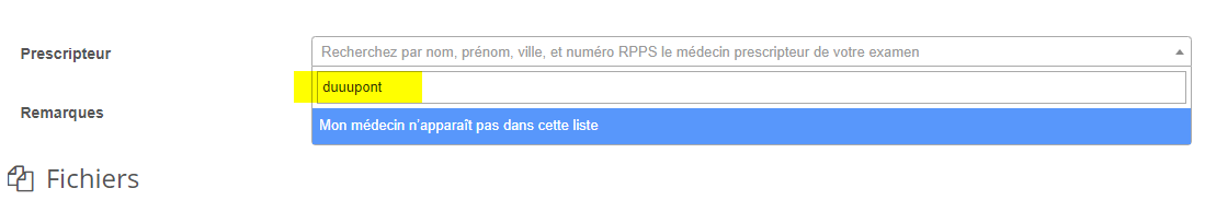 Dans le cas où le patient ne trouve pas le prescripteur de son examen dans la liste ASIP proposée sur le portail patient, cette information est alors indiquée au centre