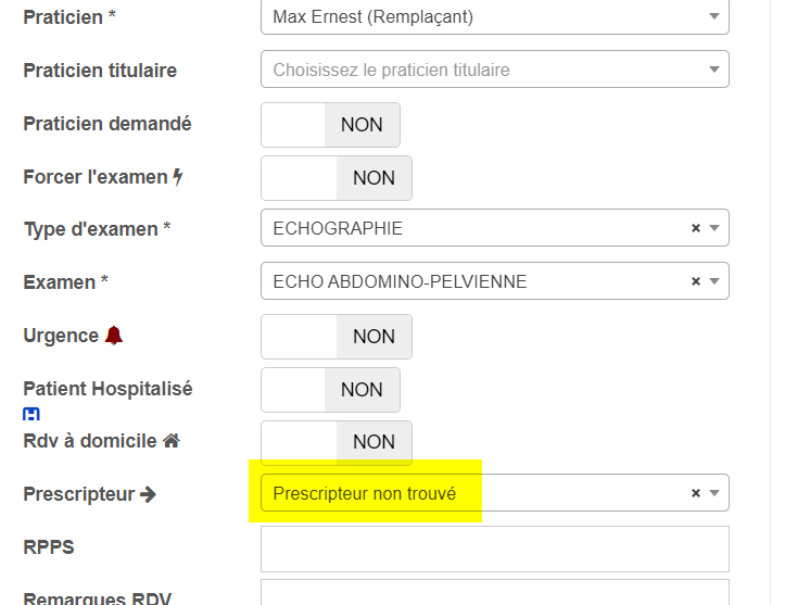 Sur le rendez-vous, une phrase d'information indique que le patient n'a pas trouvé son prescripteur lors de la prise de rendez-vous en ligne