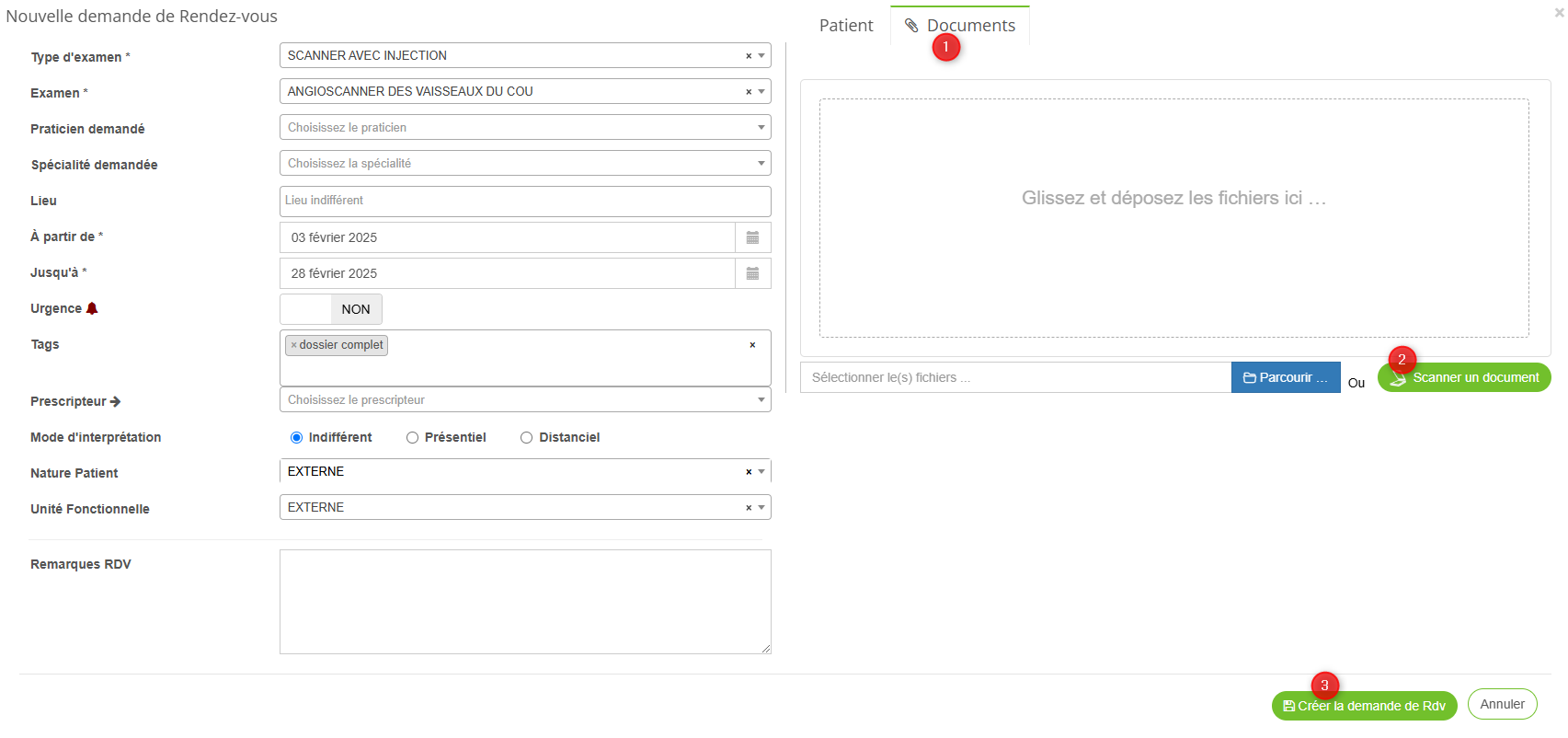 - Complétez les parties "demande de rendez-vous" et "patient" comme habituellement