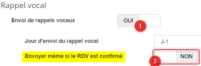 - A la rubrique Rappel vocal, sur la ligne "envoyer même si le rendez-vous est confirmé", basculez le bouton su NON