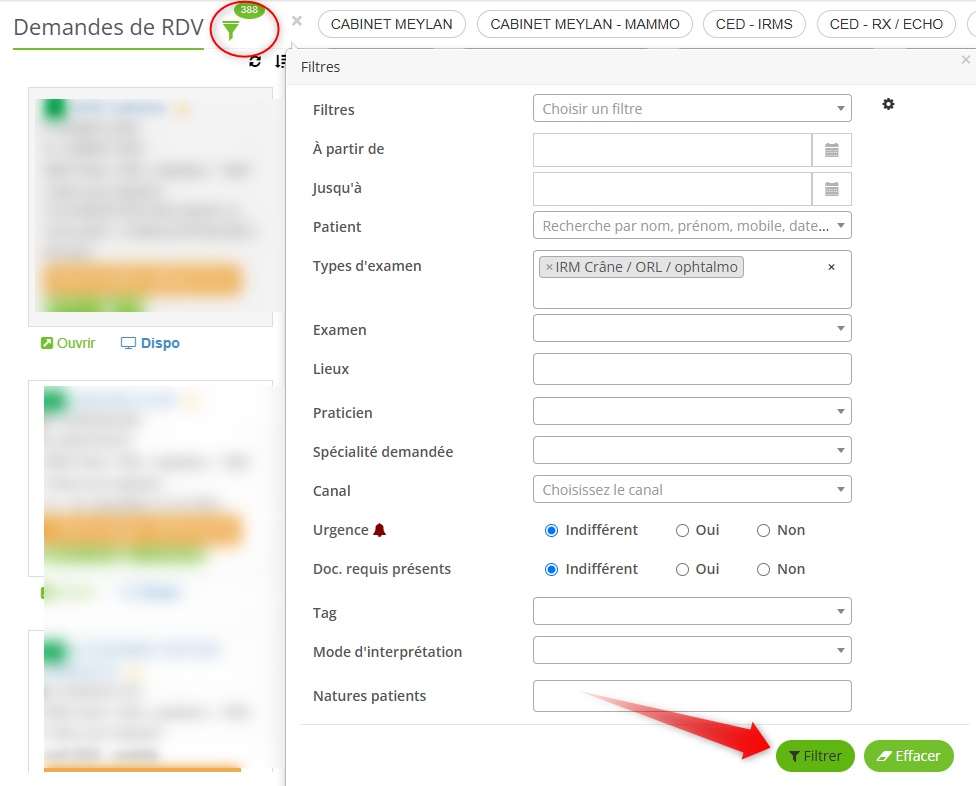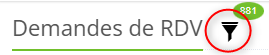 => le nombre de demandes de rendez-vous correspondant à votre(vos) filtre(s) s'affichent au niveau de l'entonnoir (devenu vert) même pour un nombre supérieur à 200