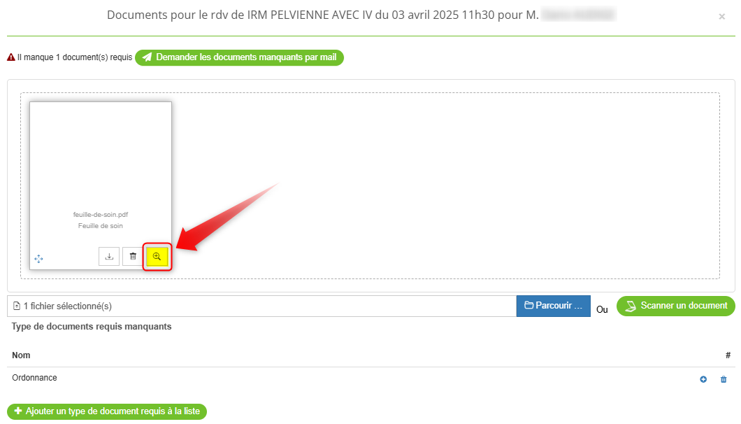 Lorsque vous cliquez sur l'icône des documents sur un rendez-vous