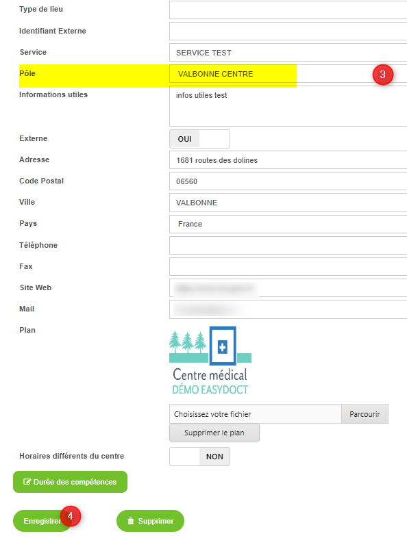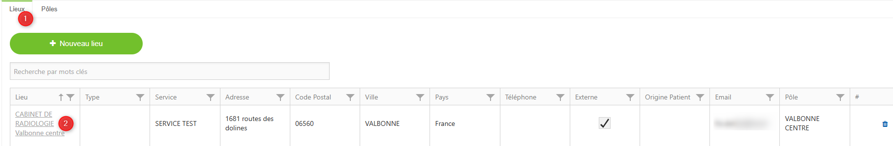 - Cliquez sur le nom d'un lieu et choisissez dans le menu déroulant le pôle dont il dépend