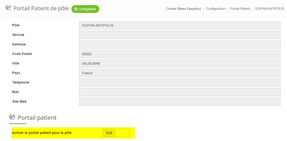 - Sur la ligne "Activer le portail patient pour le pôle", basculez le bouton sur OUI