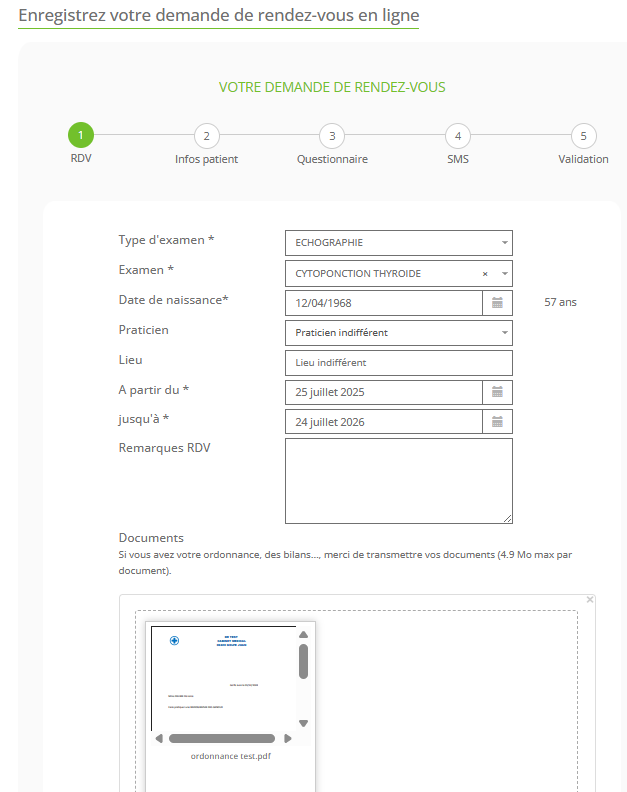 - Un patient choisit un examen non prenable en ligne mais pour lequel une demande de rendez-vous est possible