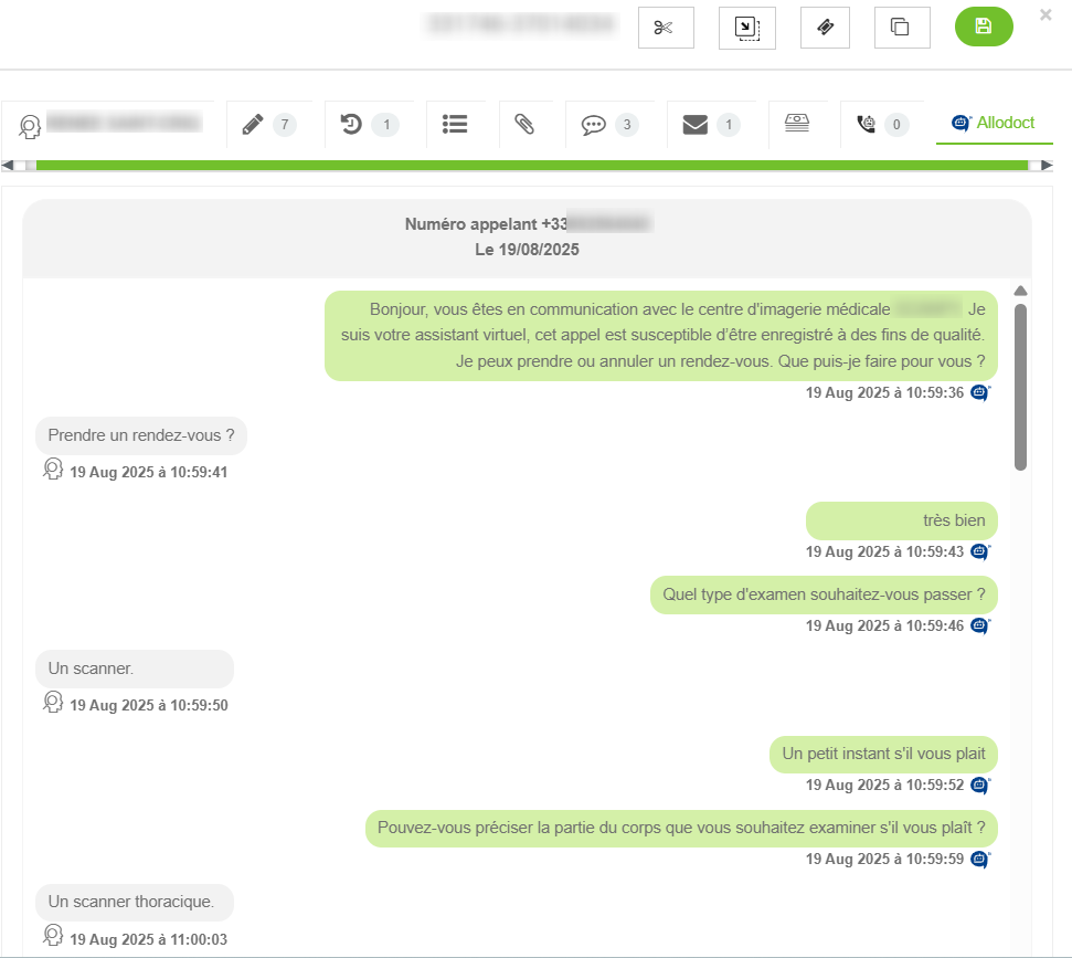 - Les échanges entre le patient et Allodoct s'affichent :