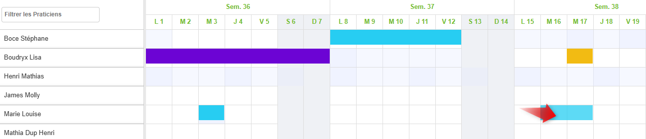 - SOIT faire glisser la bande colorée de l'absence sur le tableau (cliqué-glissé)