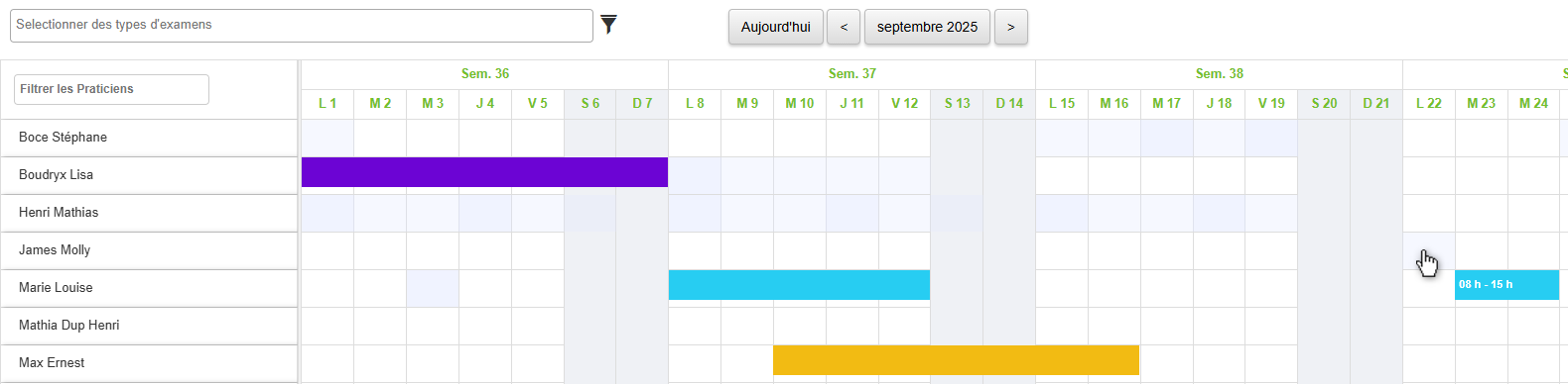 Rappel : sur le tableau des absences, les médecins planifiés sur l'agenda sont visibles sous forme de bandes grises (foncé : journée entière, clair : 1/2 journée).