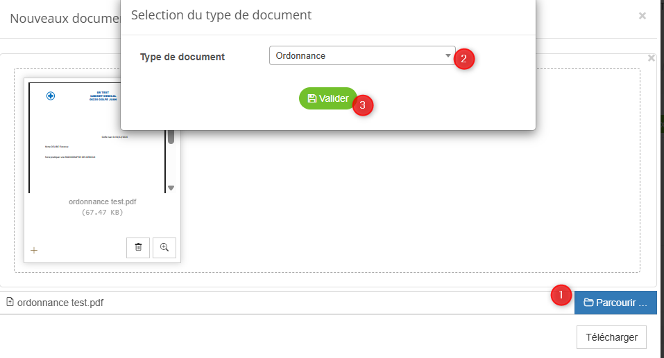 Choisissez dans la liste déroulante le type de document (ordonnance, analyse sanguine, compte rendu etc...) puis cliquez sur valider