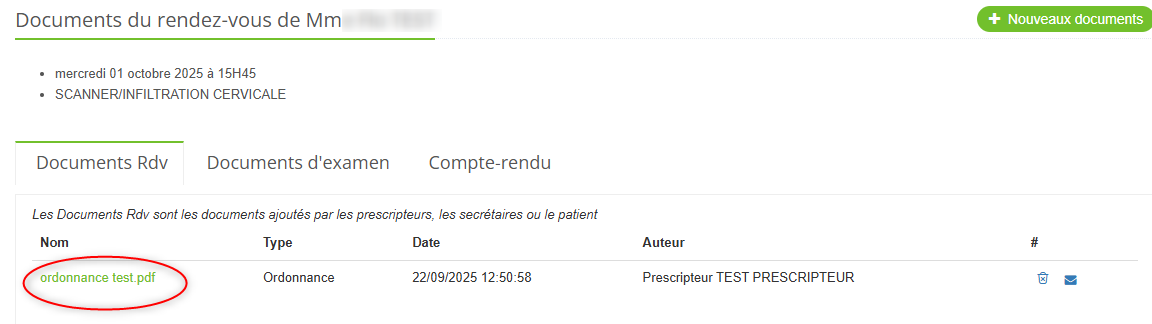 => le document est intégré sur le rendez-vous et il est alors visible par les utilisateurs du centreNB : la corbeille en bout de ligne vous permet de supprimer le document en cas d'erreur.