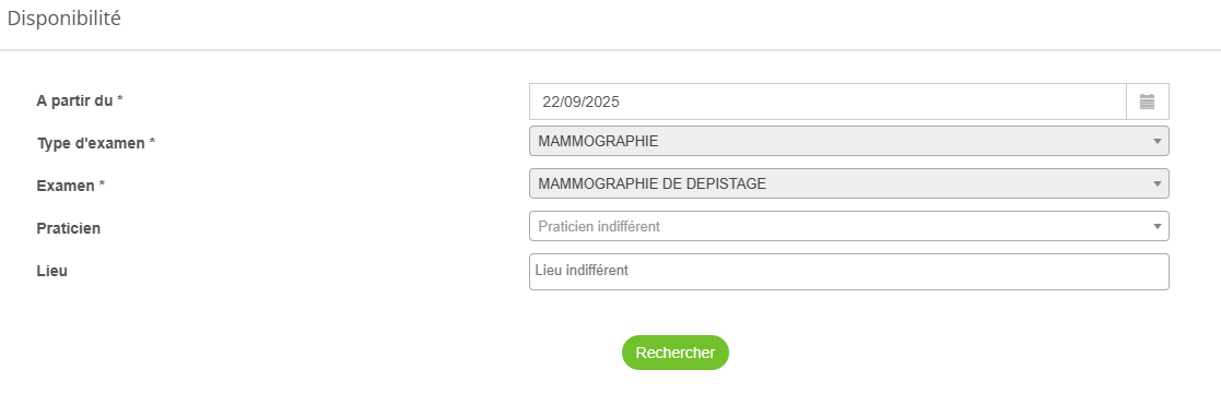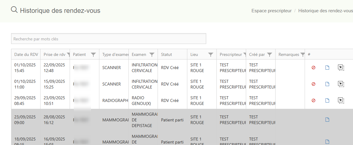 - Le tableau d'historique vous affiche les informations des rendez-vous pris pour vos patients : dates, examen, statut du rendez-vous, remarques. Les lignes grisées correspondent aux rendez-vous passés.