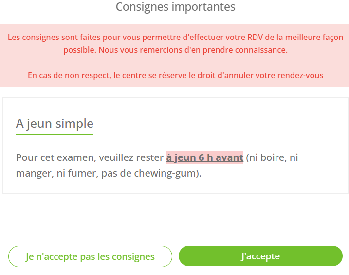 La consigne médicale de se présenter à jeun est d'abord délivrée au patient/prescripteur. Celui ci doit accepter la consigne pour poursuivre la prise de rendez-vous