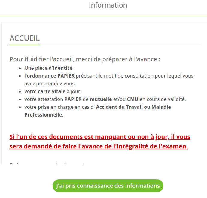 Puis une information administrative lui est délivrée sur son futur accueil. Le patient/prescripteur doit cliquer sur "j'ai pris connaissance des informations" pour poursuivre la prise de rendez-vous