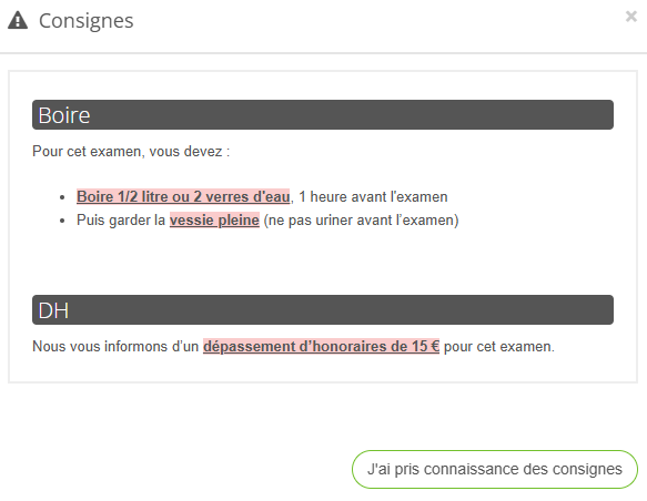 - Lors d'une prise de rendez-vous, après avoir choisi un créneau, le patient/prescripteur visualisera d'abord les consignes médicales (qu'il devra accepter pour poursuivre la prise de rendez-vous), puis il visualisera les informations (dont il signalera avoir pris connaissance)