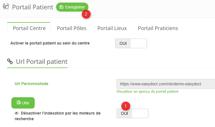 ⚠ ATTENTION ! cette désindexation ne doit être utilisée que dans certains cas particuliers, puisqu'une fois la désindexation activée, le portail patient ne sera plus proposé en résultat de recherche !