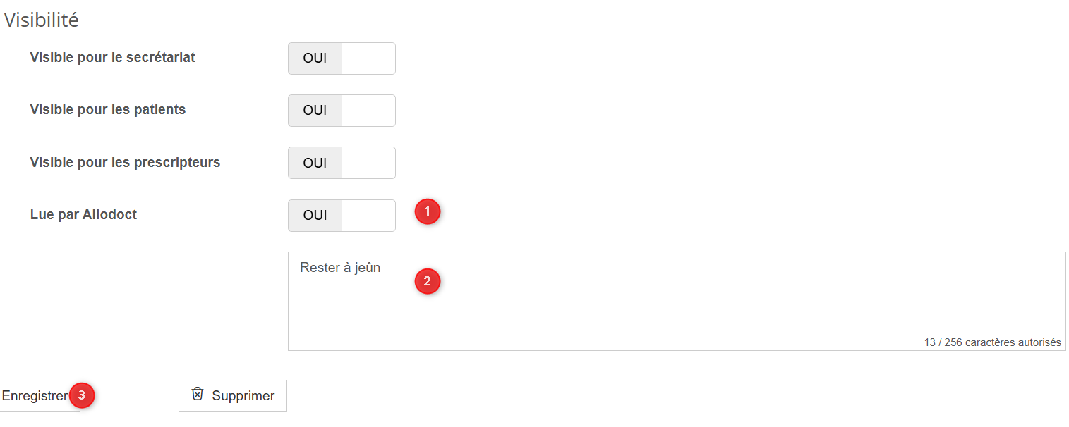 - Puis à la rubrique Visibilité basculez le bouton sur OUI sur la ligne "lue par Allodoct"