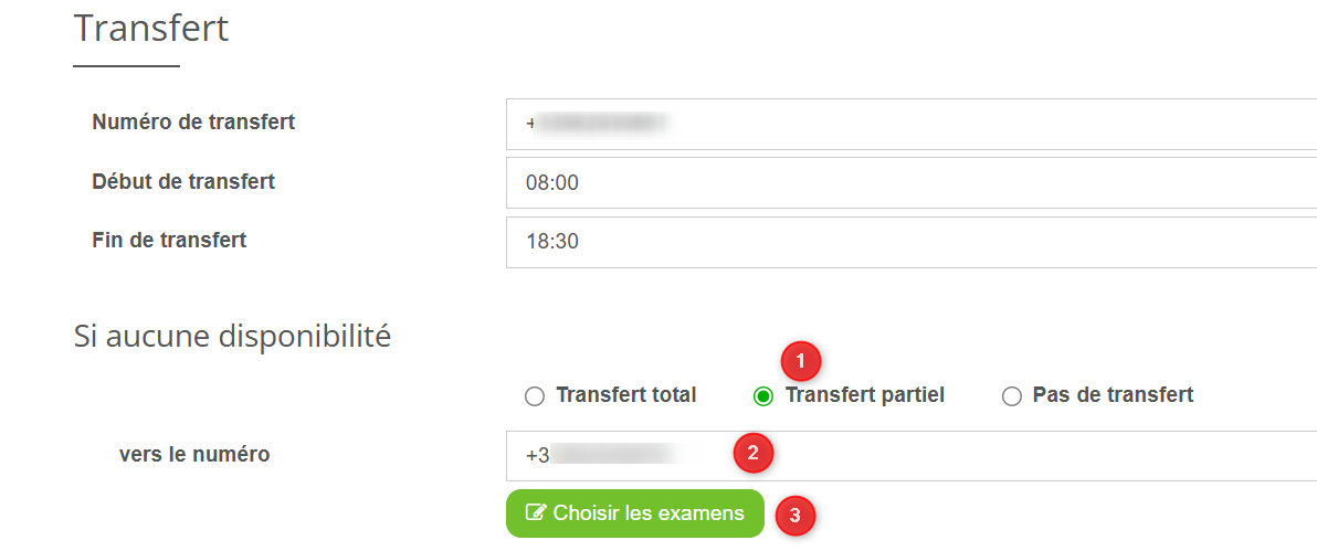 ⚠ les examens non cochés ne seront pas transférés vers ce numéro mais le message d'impasse fonctionnelle paramétré sera diffusé au patient