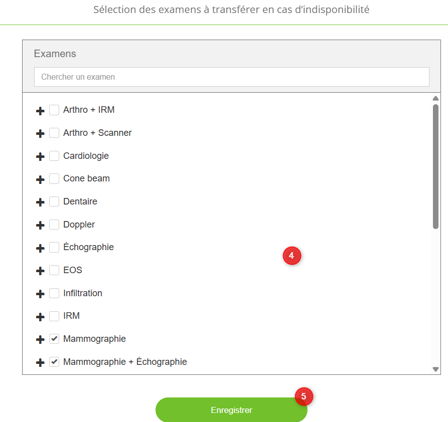 Définition : Choisir les examens pour lesquels le transfert d'appel vers le secrétariat va être activé si aucune disponibilité