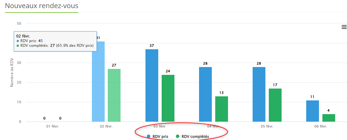 - Le graphique "Nouveaux rendez-vous" compare les rendez-vous pris avec ceux complétés par les patients après la prise de rendez-vous
