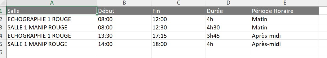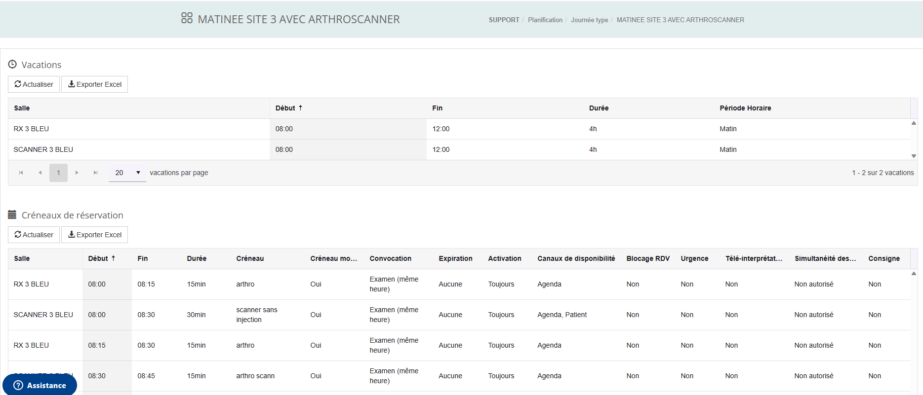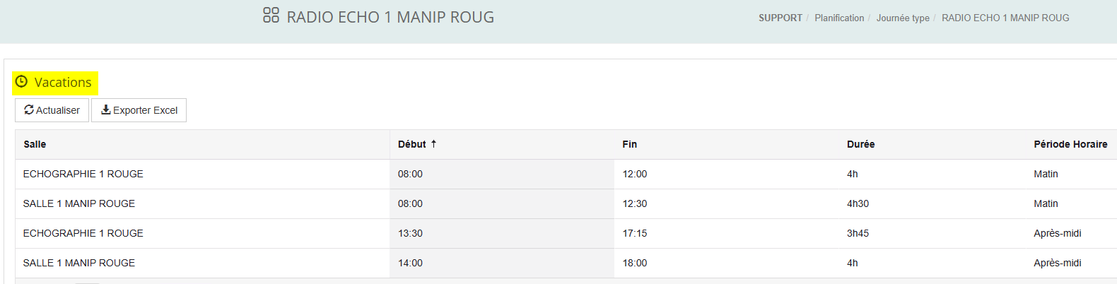 VACATIONS : affichage des vacations composant la journée type : salles, horaires de début et fin, durée et période horaire