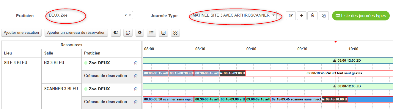 => la composition de la journée type s'affiche, composée de deux parties : vacations et créneaux de réservation
