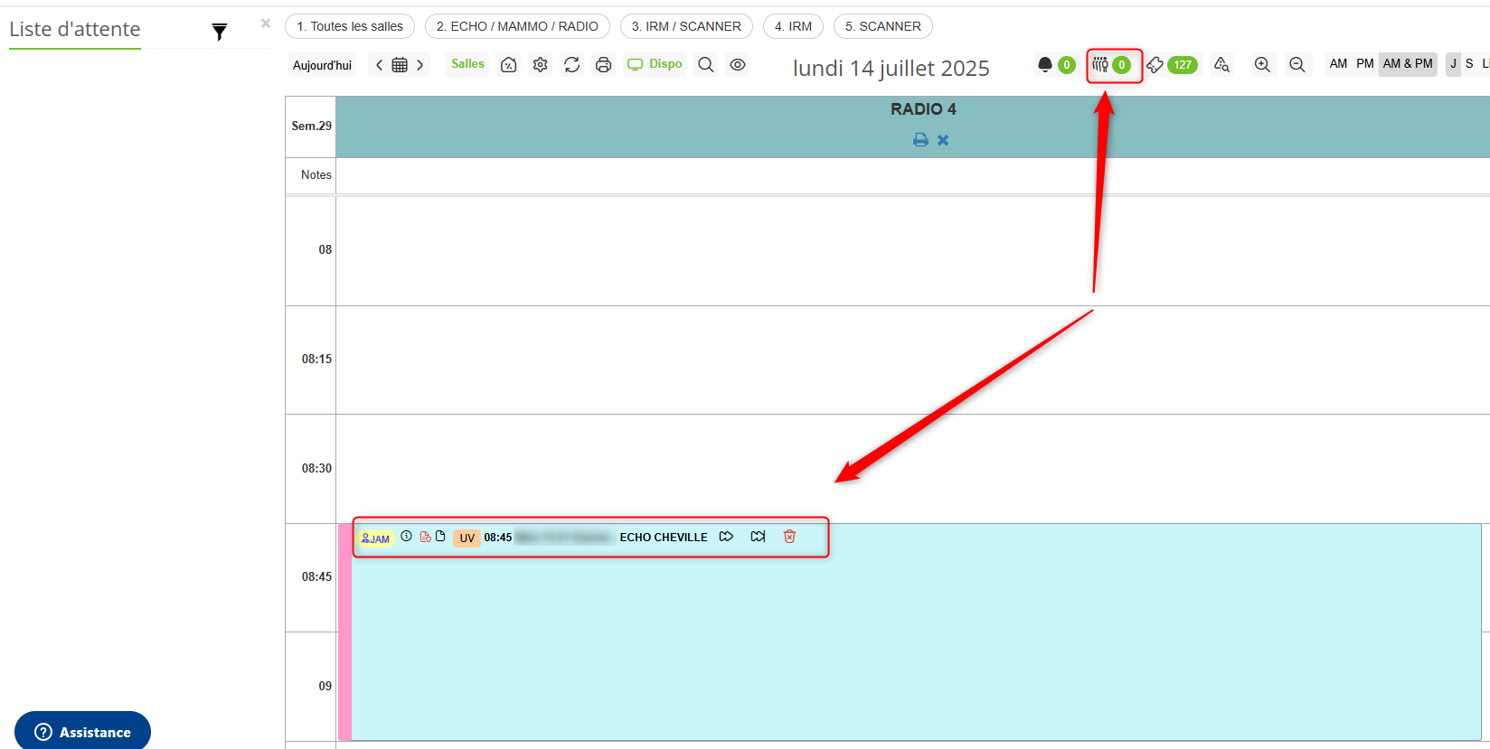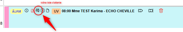 - Cliquez sur l'icône de la liste d'attente (le chiffre indique le nombre de rendez-vous en liste d'attente)