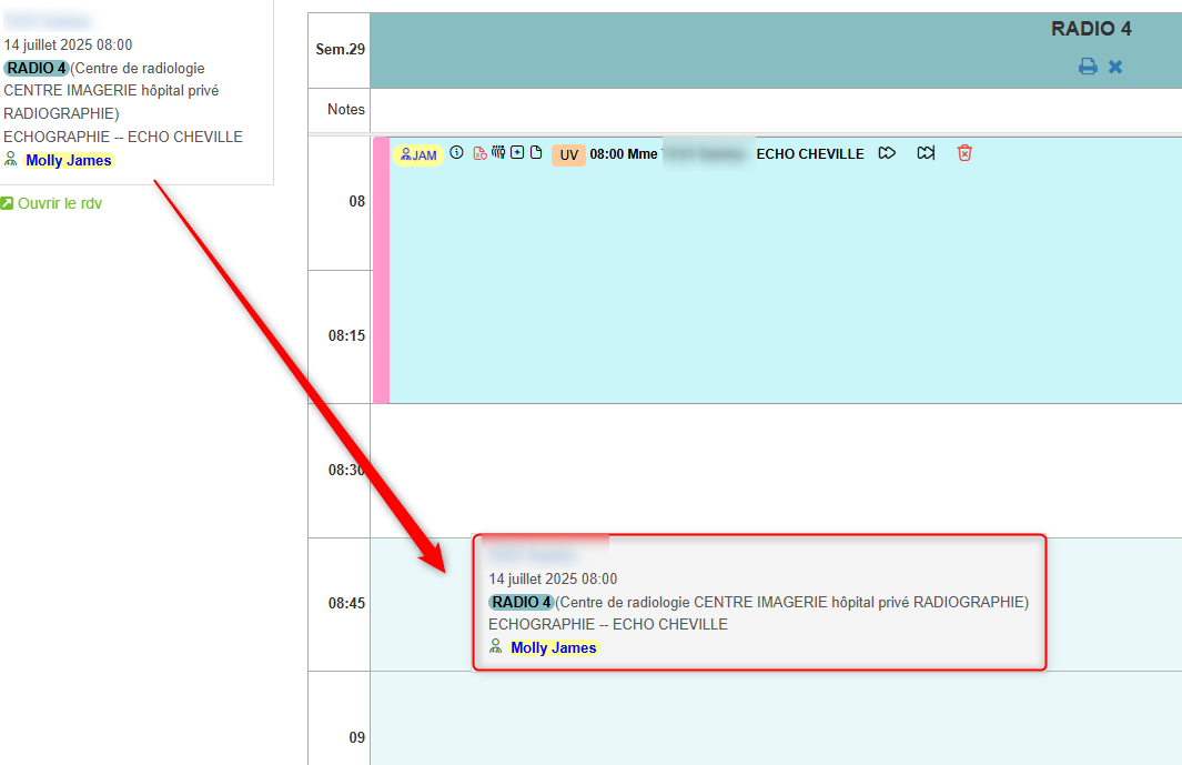 - Par un simple cliquer-glisser, déposez la vignette de rendez-vous de la liste d'attente sur la case libre de rendez-vous