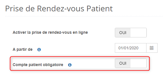 - Sur la ligne "Compte patient obligatoire", basculez le curseur sur OUI