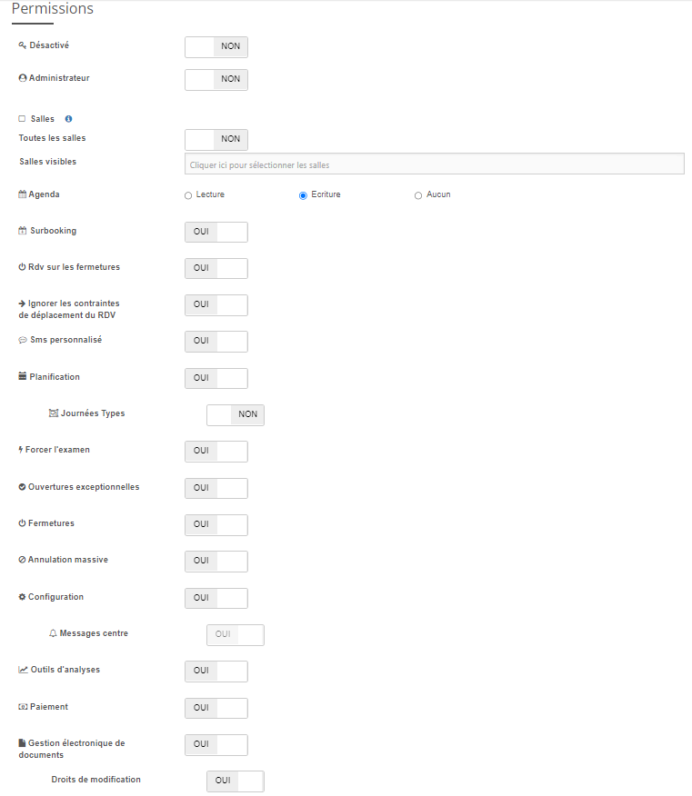 Seuls les droits "Surbooking", "Rdv sur les fermetures", "Sms personnalisé", "Forcer l'examen" et "Annulation massive" resteront à activer ou non