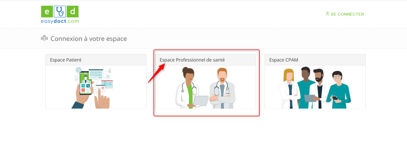 - Cliquez sur SE CONNECTER, puis dans Espace professionnel de santé