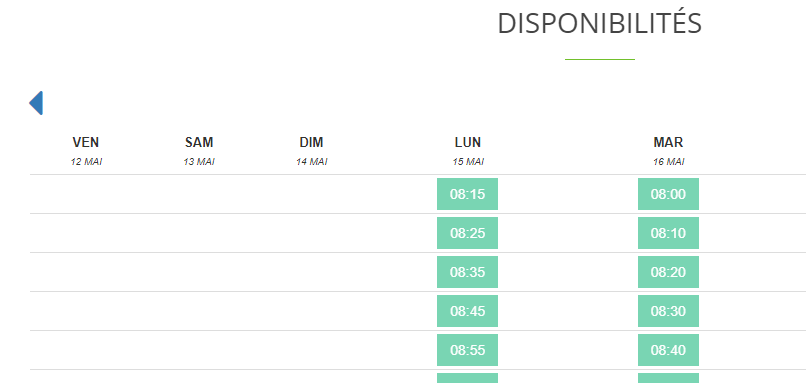 - Dans cet exemple : lors d'une recherche effectuée mi avril, la patient n'a accès qu'aux disponibilités à partir du 15 mai