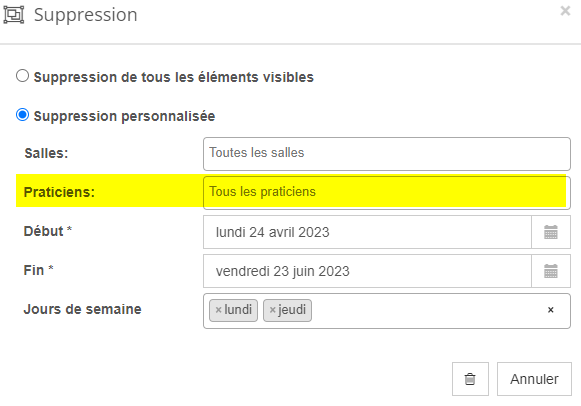 Il est désormais possible d'effectuer une suppression personnalisée dans la planification de l'agenda en filtrant par un ou plusieurs praticien(s)