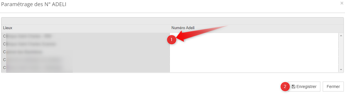 - En face de chaque lieu, double cliquer dans la colonne "Numéro Adéli", afin de le renseigner lieu par lieu