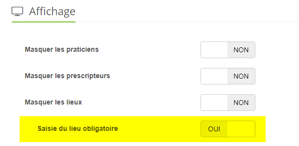 - Sur la ligne "Saisie du lieu obligatoire", basculez le bouton sur OUI