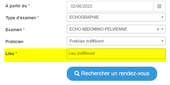 Il ne pourra alors rechercher un rendez-vous qu'après avoir sélectionné un lieu dans le champ Lieu*